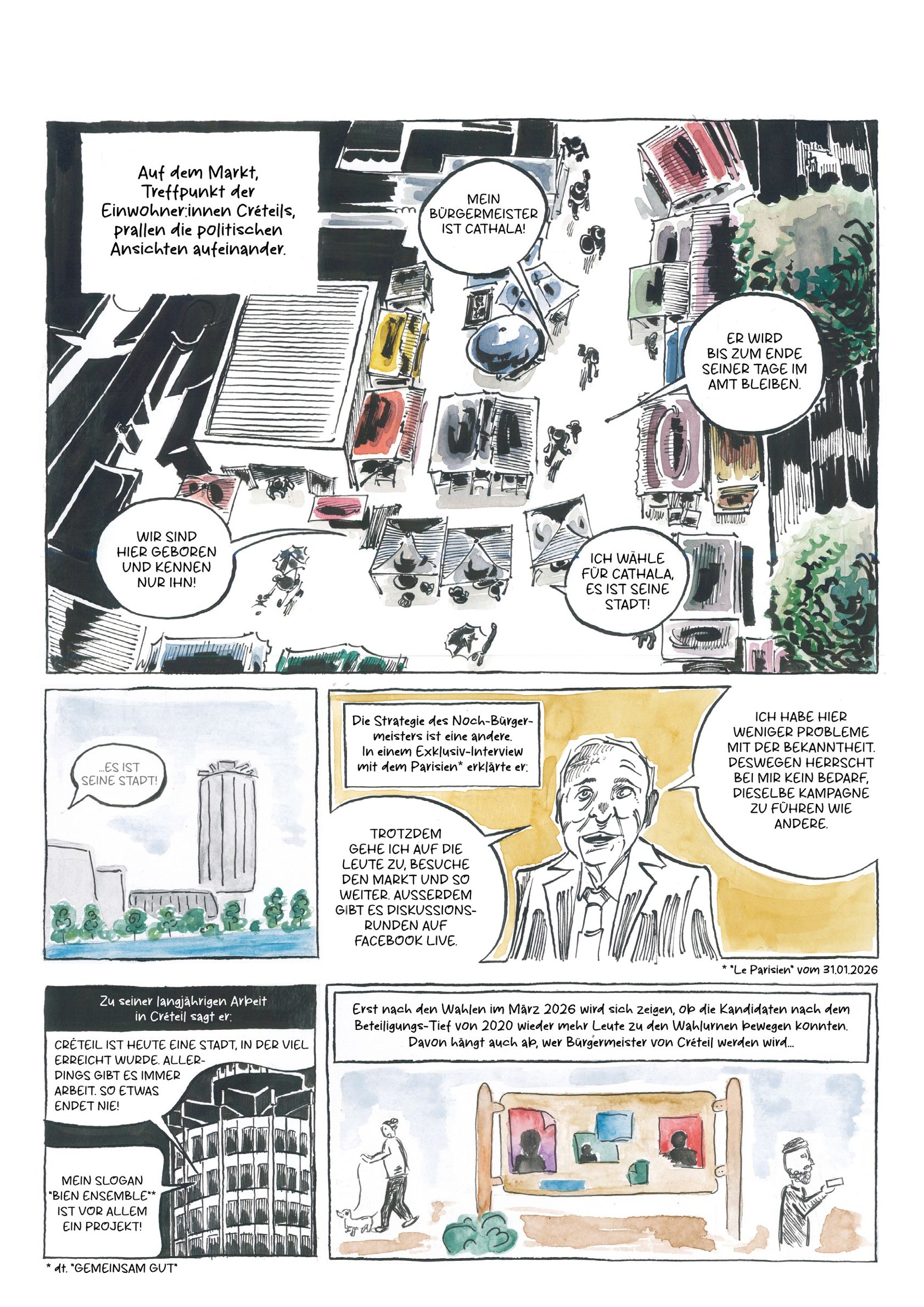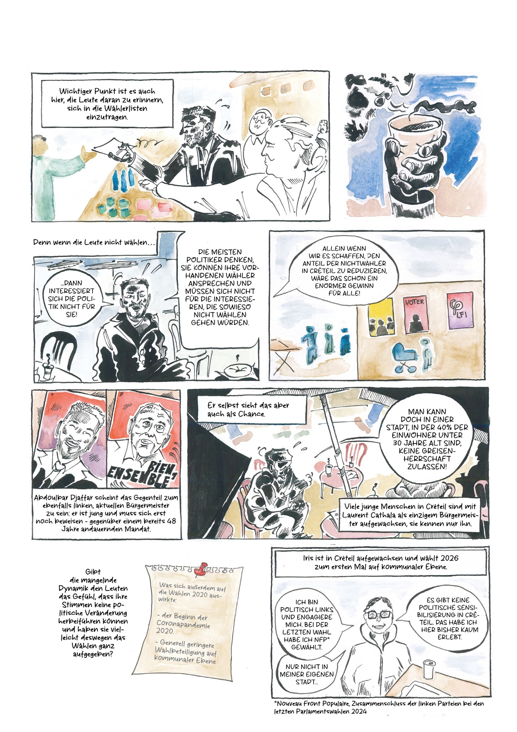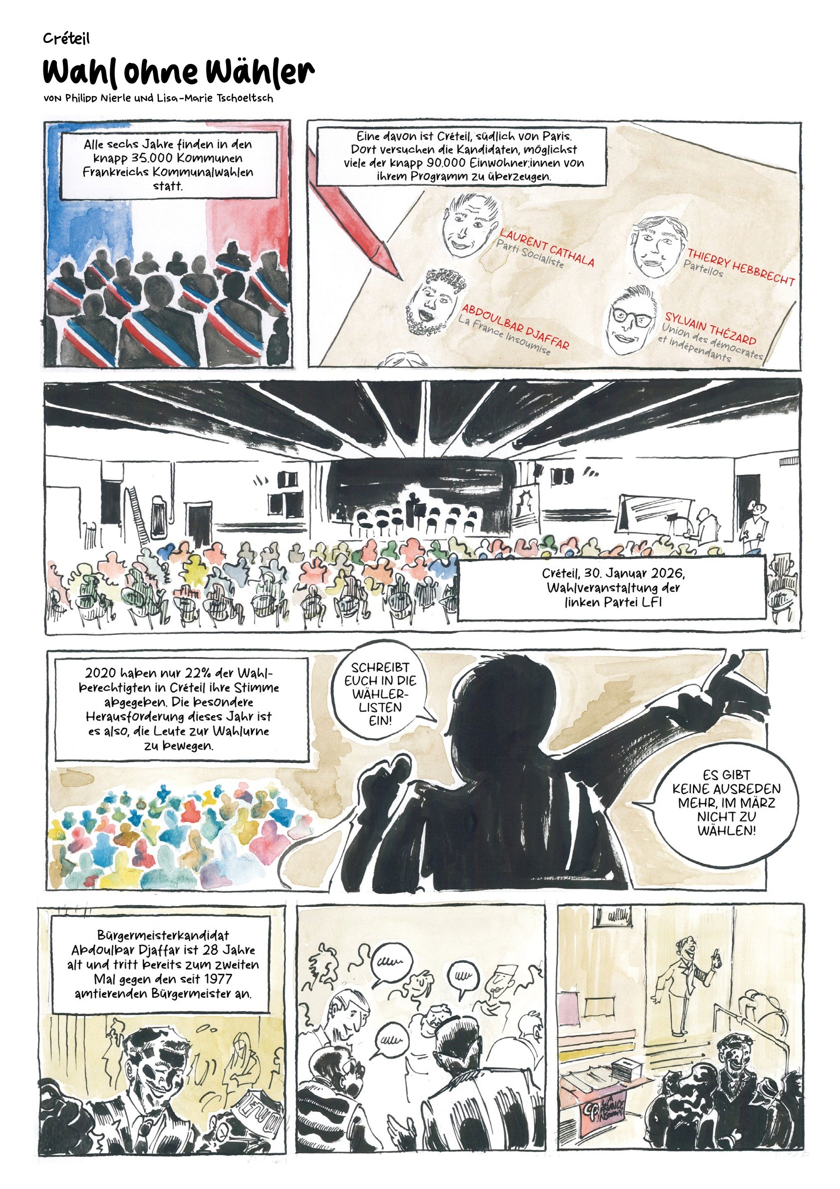 Comic-Reportage zu den Kommunalwahlen 2026 in Créteil, Frankreich. Gemeinsam mit Lisa-Marie-Tschoeltsch.